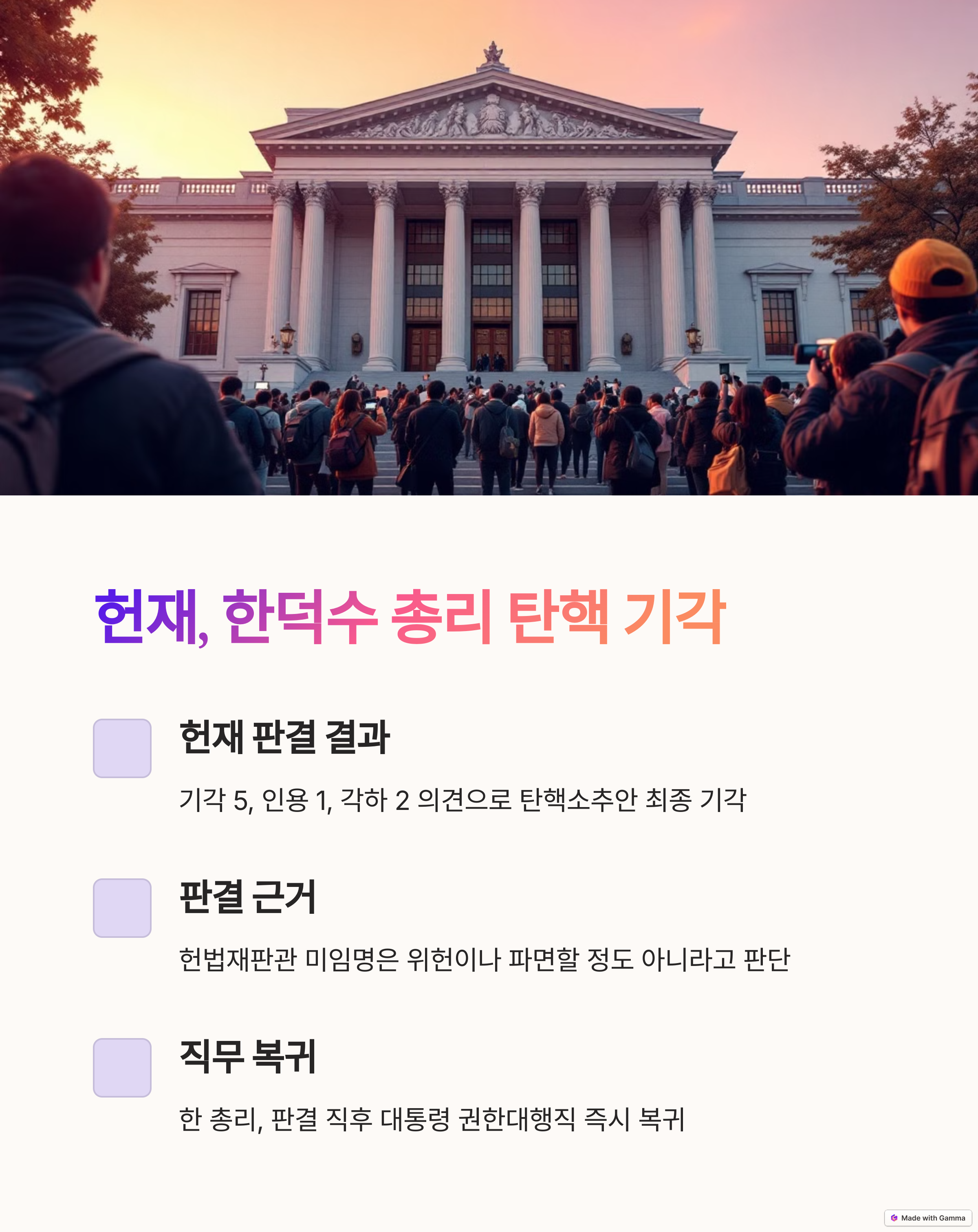 | 한덕수 총리 탄핵 기각 | 헌재 재판관 8명 중 5명 기각 의견으로 결정 |