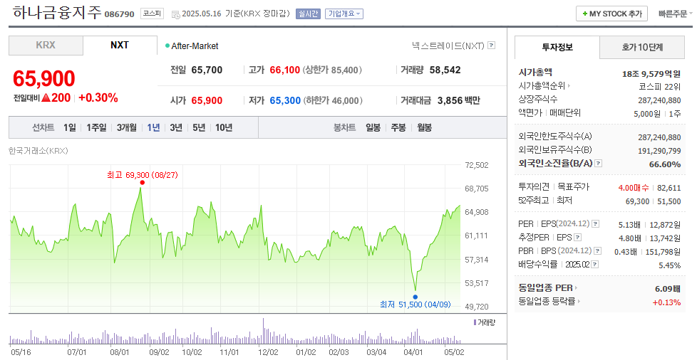 2025년 5월 16일 기준 하나금융지주 주가는 65,800원에 마감했습니다.